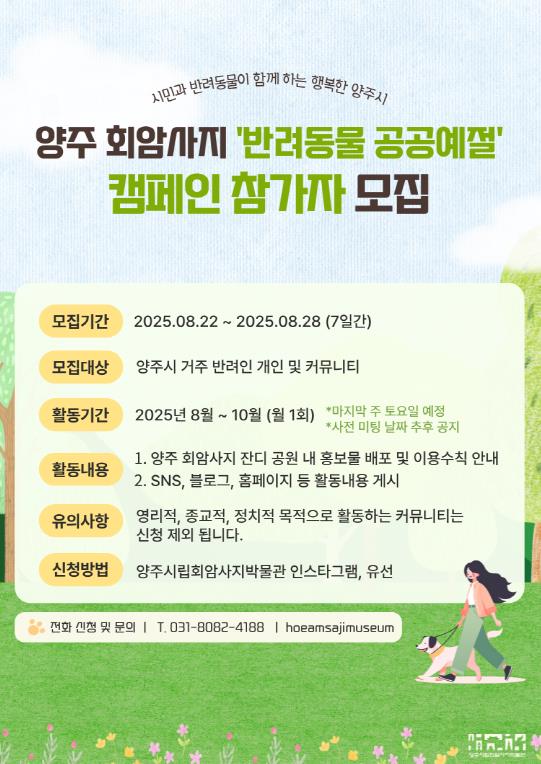 양주시립회암사지박물관 관계자는 “이번 캠페인을 통해 올바른 반려문화 정착은 물론 지역의 소중한 문화유산 보존과 계승에도 앞장서겠다”고 전했다.