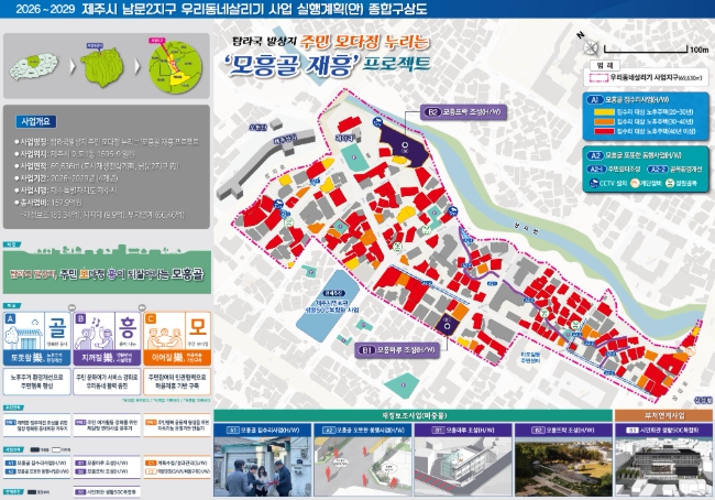 남문2지구 우리동네살리기 사업은 이도1동 일원(69,630㎡)을 대상으로 ‘탐라국 발상지, 주민 모다정 누리는 모흥골 재흥’을 목표로 2026년부터 4년간 총 93억 원(국비 50억 원, 지방비 43억 원)이 투입된다.