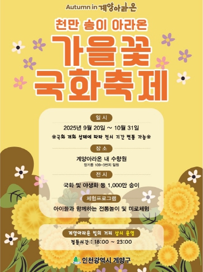 특히 올해 축제는 국화와 야생화 천만 송이에 더해 지난 8월 말부터 만개한 2천만 송이 백일홍이 함께 어우러져 총 3천만 송이 꽃물결을 이룬다. 지난 6월 파종한 백일홍은 여름 폭염과 폭우를 이겨내고 화려한 꽃을 피웠으며, 계양아라온의 잔잔한 물결과 어우러져 장관을 연출한다. 대형 햄스터, 나비 조형물 등이 설치된 다채로운 포토존은 가족 단위 방문객에게 인기가 높고, 쉼터와 파라솔도 마련돼 관람객들의 편안한 휴식을 돕는다.