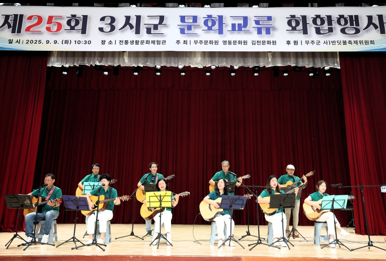 무주전통생활문화체험관에서 열린 이날 행사는 무주군이 주최하고 무주문화원이 주관한 제25회 3시·군 문화교류 화합행사로, 맹갑상 무주문화원장과 이기양 김천문화원장, 백승원 영동문화원장을 비롯한 각 지역 문화원 회원 230여 명이 함께 했다.