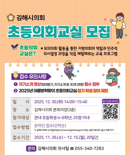 모집 대상은 김해시 관내 초등학생 4~6학년 25명이며, 선착순 접수로 진행된다. 참여를 원하는 학생은 12월 15일까지 김해시의회 누리집을 통해 신청하면 된다.