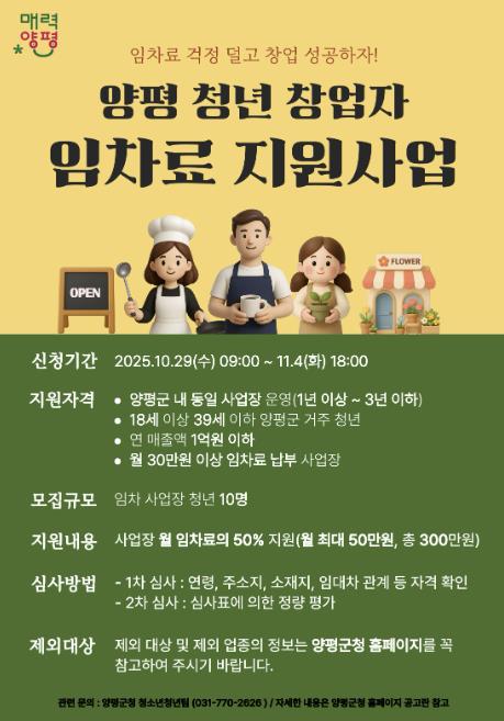 지원 대상은 △양평군에 주소를 둔 18세 이상 39세 이하 △공고일 기준 사업자등록증명 상 개업일 1년 이상 3년 이하 △연 매출액 1억 원 이하 △월 임차료 30만 원 이상 납부 중인 청년 창업자이다.
