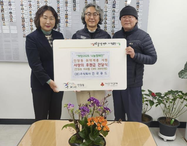 한편 ㈜건국푸드는 인창동에 소재한 축산 가공품 유통·도매 업체로, 기업의 사회적 책임을 실천하기 위해 2020년부터 매년 연말 인창동에 후원금을 지정 기탁하며 지역사회에 지속적인 나눔을 이어오고 있다.