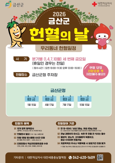 군은 분기별 1회 세 번째 금요일에 금산군청 주차장에서 사랑의 헌혈 버스를 운영한다.