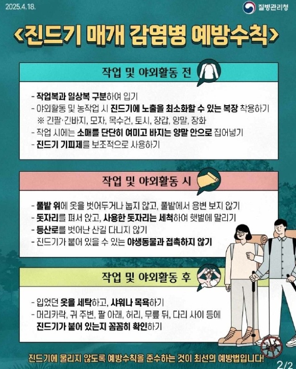특히, 9월부터 11월까지는 야생진드기 유충이 왕성하게 활동하는 시기로, 가을 행락철을 맞아 등산이나 농작물을 수확 시 각별한 주의가 필요하다.