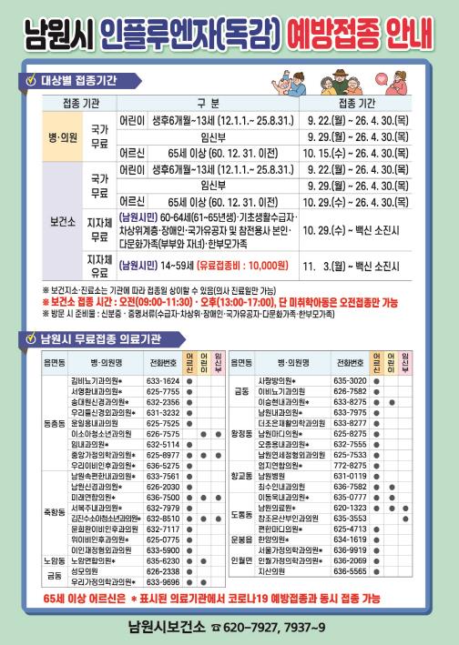 보건소 인플루엔자 예방접종은 10월 29일부터 시작하며, 우리시는 특별히 집단 면역 향상과 시민의 건강 보호, 경제적 부담 완화를 위해 남원시 주민등록자 중 60∼64세와 기초생활수급자, 차상위계층, 장애인, 국가유공자, 다문화가정, 한부모가정을 대상으로 무료 접종을 실시하고 이외 일반시민(남원시 주민등록자 중 14∼59세) 유료 접종은 11월 3일부터 시작하며 접종비는 10,000원이다.