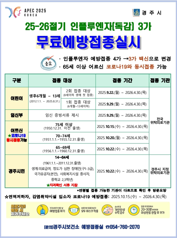 대상자별 접종 일정과 위탁의료기관은 경주시 보건소 홈페이지와 예방접종도우미 누리집에서 확인할 수 있으며, 시는 원활한 접종을 위해 사전 문의 후 방문할 것을 권장했다.