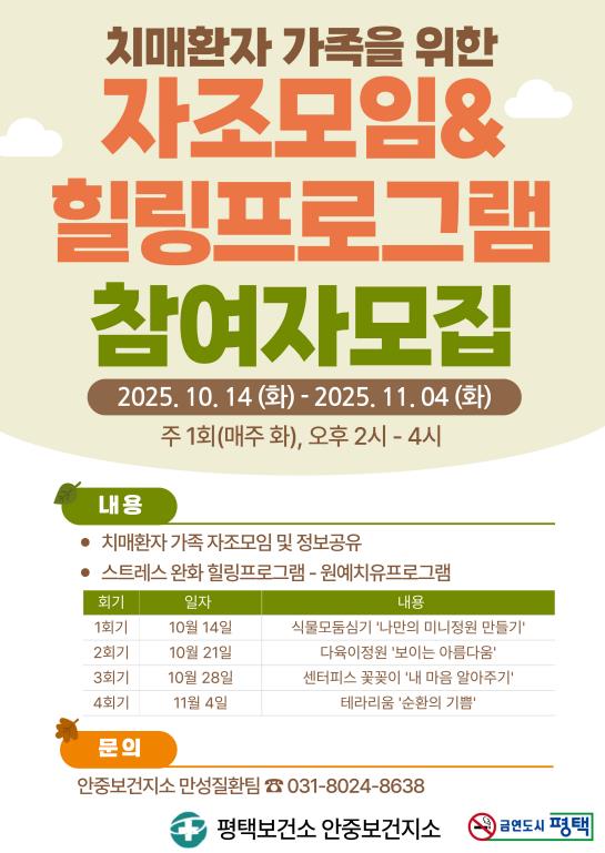 안중보건지소 관계자는 “치매 환자 가족 간 공감과 소통의 장을 개방하여 돌봄으로 인한 우울감 및 스트레스를 해소하고, 다양한 프로그램을 통해 긍정적인 마인드를 키우는 데 도움이 되도록 노력하겠다”라고 전했다.