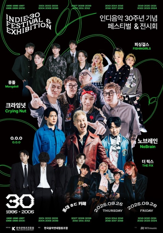 '인디 30주년 기념 페스테벌 & 전시회'는 엠와이뮤직이 주관하고 한국음악연대협동조합이 후원하는 프로그램으로, 한국콘텐츠진흥원의 대중음악 공간기획 지원사업에 선정돼 제작지원을 받는 사업이다.
