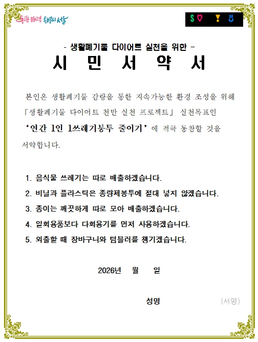 시민 실천서약은 음식물쓰레기 분리배출, 비닐·플라스틱 종량제봉투 혼입 금지, 종이류 분리배출, 다회용기 우선 사용, 장바구니·텀블러 지참 등 실생활에서 참여할 수 있는 항목으로 구성될 예정이다.