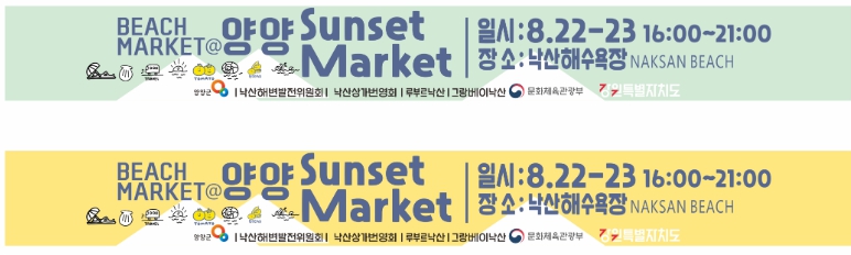 비치마켓 행사는 강원도가 추진하는 ‘테마해수욕장 운영사업’의 일환으로 열리며, 이번 썬셋마켓에는 30여팀의 셀러가 참여하여 △핸드메이드 창작품 △다양한 친환경 먹거리 △체험 프로그램 △양양 해파랑길 및 새활용센터 홍보 부스 등을 운영할 예정이다.