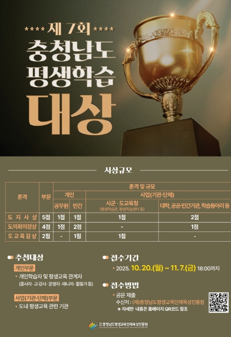 접수기간은 2025년 10월 20일부터 11월 7일까지이며, 시상식은 12월 11일 오후 2시, 아산 교원연수원에서 열린다.