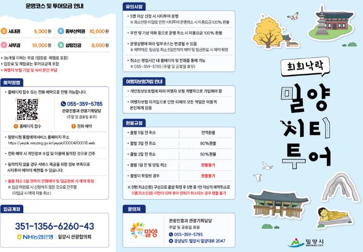 예약 및 문의는 밀양시 문화관광 홈페이지, 통합예약시스템 또는 시청 관광진흥과를 통해 가능하다.