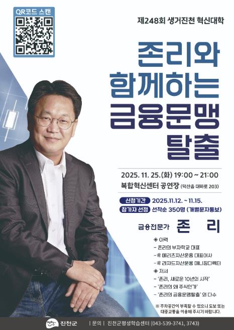 이번 강연에서는‘존 리와 함께하는 금융문맹 탈출’을 주제로, 금융 기초 지식부터 실제 투자 방법까지 알기 쉽게 풀어내며, 군민들이 경제적 자립과 안정적인 노후 준비의 중요성을 깨닫는 시간을 마련할 예정이다.