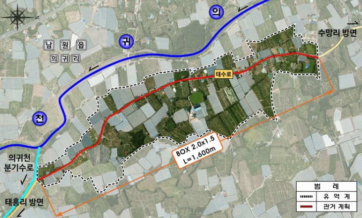 특히, 의귀1 재해위험개선지구 정비사업은 집중호우시 우수가 의귀천으로 유입되지 못해 태수로 주변 주거지와 농경지 저지대의 침수피해가 빈번하게 발생하는 곳으로 2028년까지 준공을 목표로 하고 있으며, 사업완료 시 263ha의 침수위험지역이 해소될 전망이다.