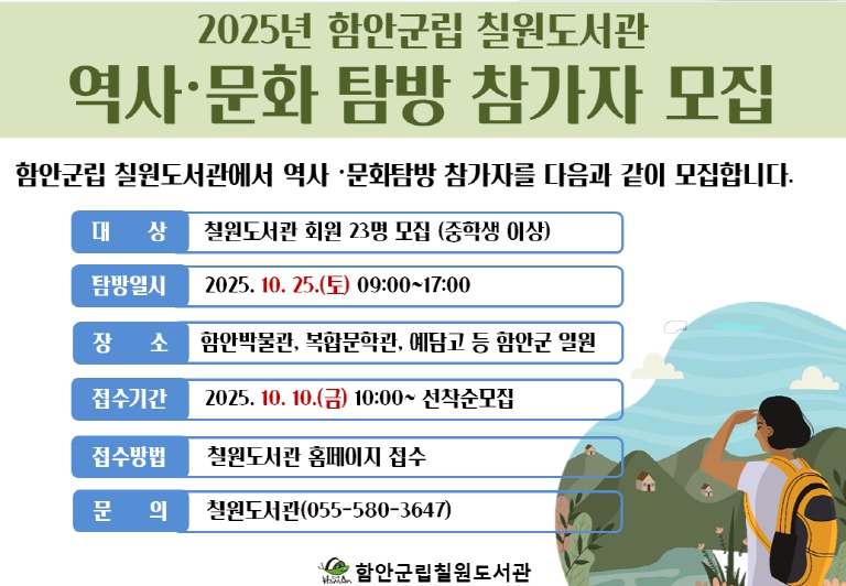 이번 탐방은 10월 25일 토요일 오전 10시 칠원도서관에서 출발하며, 예담고, 함안복합문학관, 함안박물관, 말이산고분군 등 함안 지역의 대표적인 역사·문화 공간을 방문할 계획이다. 또한 단순한 문화유산 관람을 넘어, 참가자들이 역사와 문화를 직접 체험할 수 있도록 전통장 만들기 체험 활동도 포함된다.