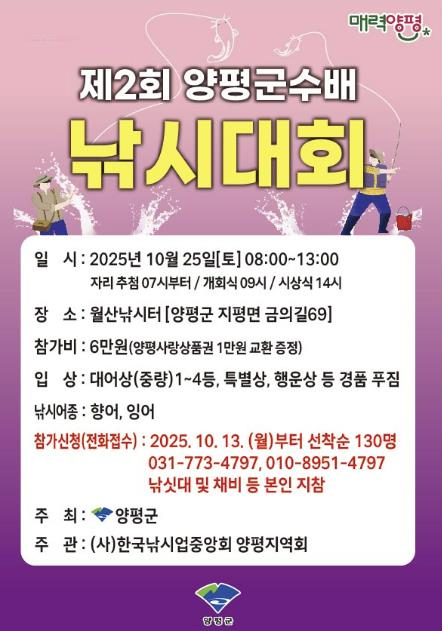 전진선 양평군수는 “양평의 맑은 물과 아름다운 자연 속에서 낚시를 즐기며 군민과 낚시 동호인 모두가 편안히 쉴 수 있는 자리가 되길 바란다”며, “이번 대회를 통해 낚시를 매개로 한 관광 활성화와 지역 경제에 활력을 불어넣을 것으로 기대한다”고 말했다.