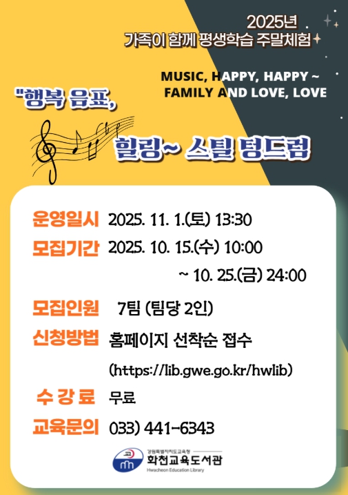 맑고 신비로운 스틸텅드럼의 음색을 가족이 함께 느끼고 표현할 수 있도록 구성했으며, 마음에 안정감을 주는 힐링 체험이 특징이다. 특강은 11월 1일 오후 1시 30분, 화천교육도서관 2층 문화교실1에서 진행된다.