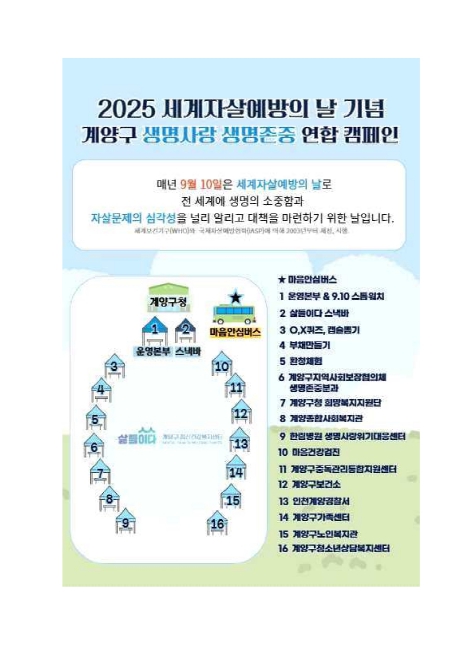 계양구정신건강복지센터가 주관하는 이번 행사는 ‘한걸음 더 다가가고, 한마디 더 건네는 날’을 슬로건으로, 지역사회 전반에 생명존중 문화를 확산하고 자살예방에 대한 인식을 제고하기 위해 마련됐다.