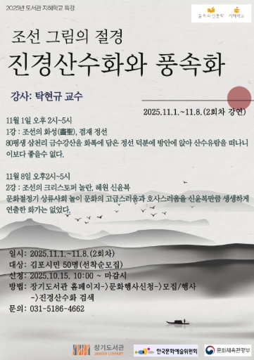 이번 강연은 지난 6월부터 9월까지 장기도서관에서 진행한 도서관 지혜학교 공모 사업으로, 탁현규 교수가 진행하며 ▲11월 1일 ‘조선의 화성(畵聖), 겸재 정선’ ▲11월 8일 ‘조선의 크리스토퍼 놀란, 혜원 신윤복’을 주제로 다룬다.