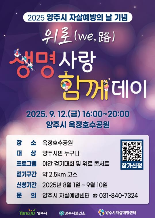 양주시 자살예방의 날 기념『위로(we,路), 생명사랑 함께 데이』는 세계 자살예방의 날(매년 9월 10일)을 기념해 자살 예방과 생명존중 문화 확산을 위해 시민과 함께 공감하고 체험하는 행사다.