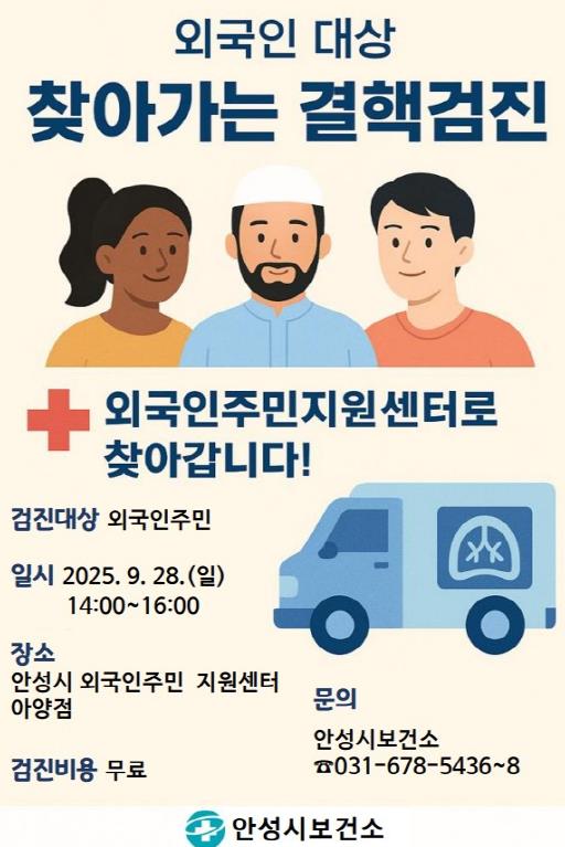 안성시보건소 관계자는 “외국인 주민도 우리 지역사회의 중요한 구성원인 만큼, 질병 예방과 건강권 보장을 위한 적극적인 접근이 필요하다”며, “이번 검진을 통해 결핵 조기 발견 및 지역사회 감염 예방에 기여할 것으로 기대한다”고 말했다.