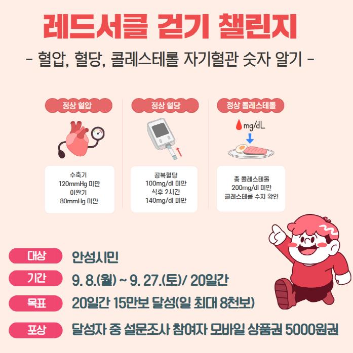 먼저 안성시보건소는 ‘워크온과 함께하는 레드서클, 자기 혈관 숫자 알기 걷기 챌린지’를 오는 9월 8일부터 27일까지 20일간 진행된다. 참가자들은 기간 내 누적 걸음 수 15만 보 달성을 목표로 하며(하루 최대 8,000보 인정), 목표를 달성하고 만족도 조사를 한 참가자에게 모바일 상품권 5,000원을 증정한다.