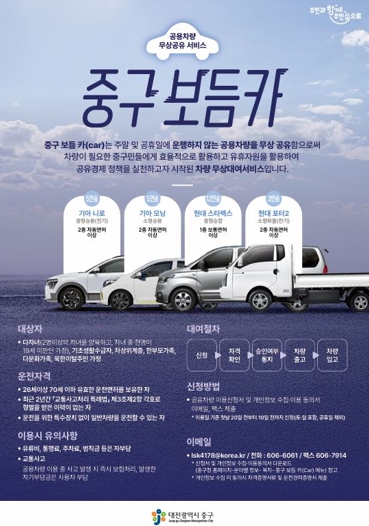 이용 대상자는 대전 중구에 주소를 둔 ▲기초생활수급자 ▲차상위계층 ▲한부모가족 ▲다문화가족 ▲북한이탈주민 가정 ▲다자녀(19세 미만 2자녀 이상) 가정이다. 대여 가능한 차량은 전기승용 1대, 경형승용 1대, 12인승 승합차 1대, 전기 1톤화물 1대 등 총 4대로 구성되어 있으며, 신청자는 별도 이용료 없이 유류비·통행료 등 차량 운행 중 발생한 실비만 부담하면 된다.