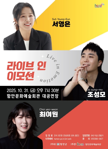 함안문화예술회관 관계자는 “이번 조성모·서영은·최여원의 ‘라이브 인 이모션(Live in Emotion)’ 콘서트는 군민과 함안을 찾아주신 관객들에게 가을밤의 낭만을 선사하고 잊지 못할 추억을 전하고자 기획됐다”며 “가족, 연인, 친구와 함께 깊어가는 가을의 정취를 만끽하시길 바란다”고 말했다.