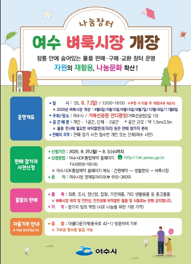 벼룩시장 판매 참여를 원하는 시민은 8월 25일부터 9월 3일까지 여수시 OK통합예약시스템 또는 팩스를 통해 신청하면 된다.