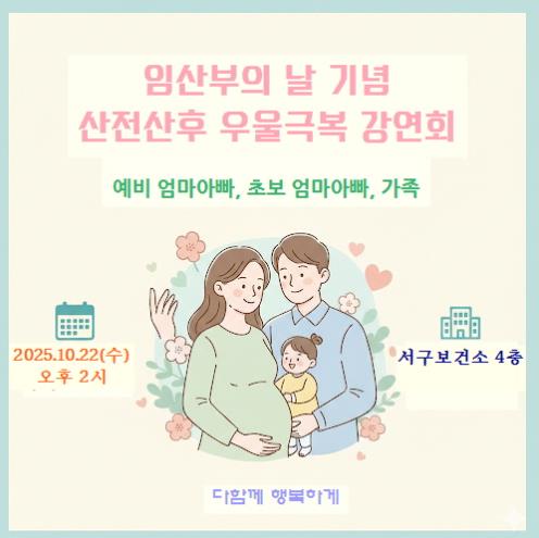 이번 강좌는 오는 10월 22일 오후 2시 30분부터 서구보건소에서 진행되며 임산부가 겪을 수 있는 급격한 호르몬 변화와 정서적 불안감에 대한 이해를 돕고, 건강한 마음으로 행복한 육아를 시작할 수 있도록 지원하기 위해 마련됐다.