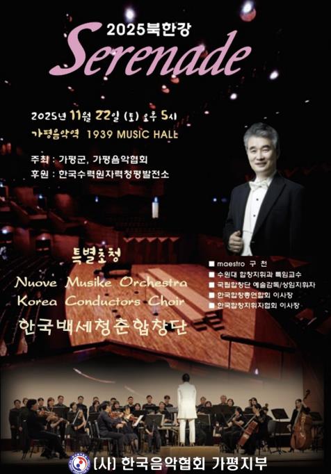 정민희 가평음악협회장은 “작은 물줄기가 하나가 돼 큰 강물이 흐르듯, 다양한 음악 장르가 한 음율로 모여 한마음이 되길 바라는 뜻을 담아 준비했다”며 “연주회를 통해 예술의 기쁨과 따뜻한 울림을 나누길 바란다”고 말했다.