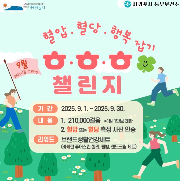 참여 방법은 ‘워크온’ 서귀포시 동부보건소 ‘하영걸을락’커뮤니티에서 참여 신청 후, 두 가지 미션 (① 9월 한 달간 목표 걸음 21만 보(하루 최대 1만 보 인정) 걷기, ② 혈압 또는 혈당 측정 사진을 1회 인증하기)을 모두 성공하고 응모하기를 누르면 된다.