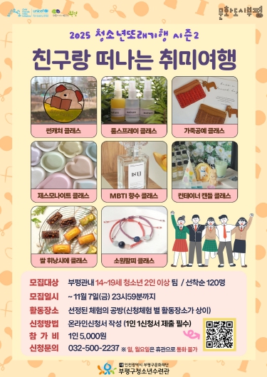 부평에 거주하거나 부평 내 학교에 재학 중인 청소년(14~19세)이라면 누구나 신청할 수 있으며, 신청 접수는 청소년수련관 누리집을 통해 선착순으로 이뤄진다.