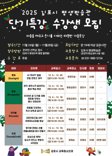 이번 특강은 일상에서 배움의 즐거움을 느끼고, 연말의 정서를 한층 풍성하게 채울 수 있도록 △별빛 △풍요 △모닥불 △손길 등 4가지 테마로 구성됐으며, 디지털·인공지능 활용, 재무·세무, 생활 풍수, 양재 실습 등 총 7개 강좌 140명의 규모로 운영된다.