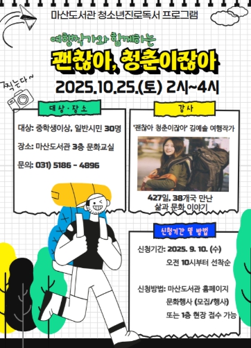 참여 신청은 9월 10일 오전 10시부터 마산도서관 홈페이지를 통해 가능하며, 현장 신청도 병행된다. 모집 인원은 여행작가에 관심 있는 청소년을 포함한 일반 시민 30명이다.