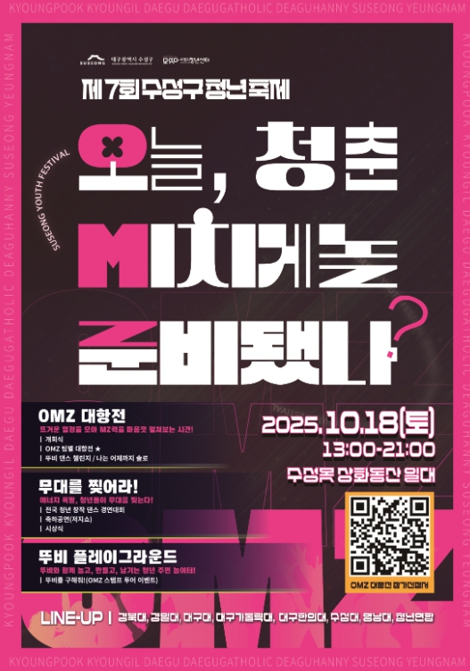 ‘OMZ(오늘 청춘 미치게 놀 준비됐나?)’를 슬로건으로 열리는 이번 축제는 대구·경북 7개 대학(경북대학교, 경일대학교, 대구가톨릭대학교, 대구대학교, 대구한의대학교, 수성대학교, 영남대학교)의 총학생회와 청년단체가 직접 참여해 기획한 청년 주도형 축제다.
