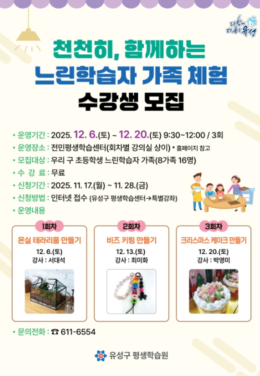 정용래 유성구청장은 “이번 프로그램이 느린학습자의 가족 간 유대감과 성취감을 높일 수 있는 기회가 되길 바란다”라며 “앞으로도 모든 주민이 함께 성장할 수 있는 평생학습 프로그램을 운영하겠다”라고 말했다.