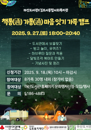 이번 프로그램은 마산도서관과 김포시종합사회복지관이 협업하여 진행하며, 가족 단위로 8팀을 모집한다. 다양한 레크리에이션 활동과 하브루타 강의가 접목된 가족 캠프 프로그램이다.