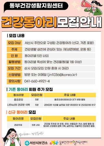한편, 건강 동아리 모집에 대한 사항은 서산시 동부건강생활지원센터에 문의하면 된다.
