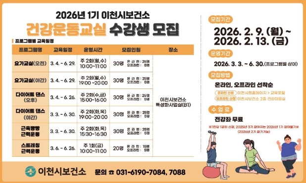 운동교실 참여를 원하는 시민은 2월 9일부터 13일까지 이천시 누리집(홈페이지) 교육포털 시스템에서 신청하면 된다.