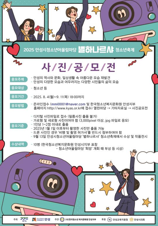 행사 관계자는 “이번 공모전이 청소년들이 직접 안성의 가치를 재발견하고, 지역 곳곳의 아름다움을 새롭게 바라보는 계기가 되길 바란다”고 전했다.