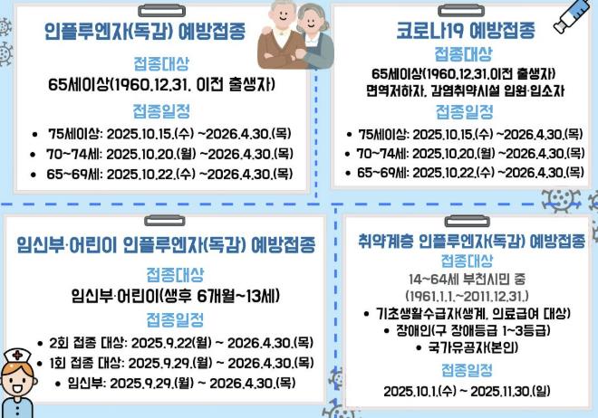 김은옥 부천시보건소장은 “코로나19 환자 수가 9월까지 증가세를 보이고 있는 상황에서, 65세 이상 어르신의 건강을 위해 인플루엔자와 코로나19 백신의 동시접종을 권장한다”며 “시민들이 대상자별 일정을 미리 확인해 접종 시기를 놓치지 않도록 적극 참여해주길 바란다”고 당부했다.
