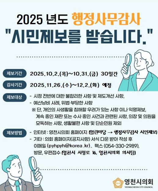 참여는 영천시의회 홈페이지 행정사무감사 시민제보 게시판이나 방문 및 우편 등 다양한 방법으로 할 수 있으며,