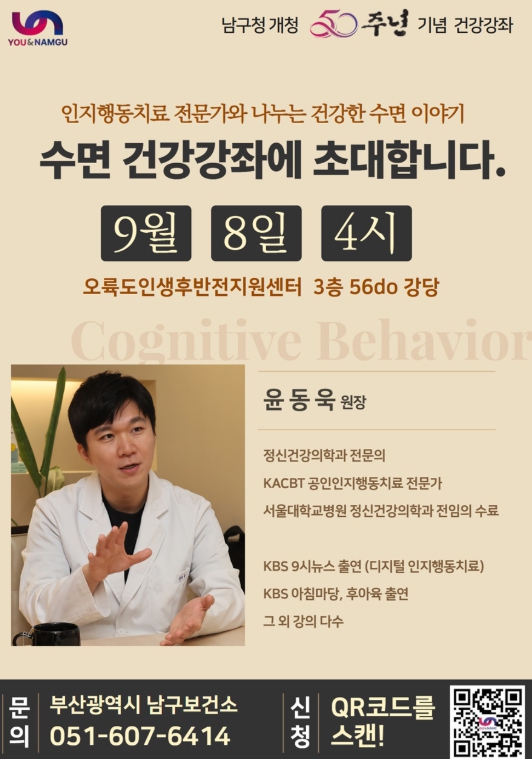 해당 강좌는 주민의 수면 개선을 위해 추진하는'2025년 꿀수면 꿀건강'사업으로, 인지행동치료 전문가(YD퍼포먼스 인지행동치료 연구소장 윤동욱)와 함께 수면 관리, 특히 인지행동치료에 대한 궁금증을 다루게 되며 주민 누구나 참석할 수 있다.