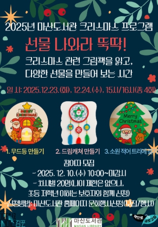 컬러링과 다각면 조립을 통한 크리스마스 무드등 만들기, 거미줄 모양의 매듭을 지어 드림캐쳐 만들기, 소원을 적은 카드를 만들어 도서관 내 크리스마스트리에 걸어보기 등을 통해 마산도서관 이용자에게 소소한 행복을 선사할 예정이다.