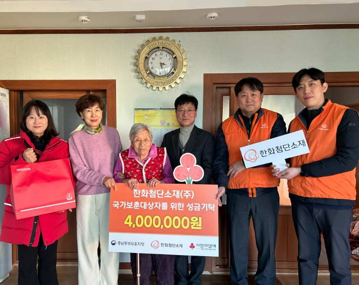 다양한 사회공헌으로 지역사회의 나눔문화를 선도하는 한화첨단소재는 올해 6월 호국보훈의달 맞이 보훈대상자 지원사업에 이어 연말에도 충남동부보훈지청과 연계하여 따뜻한 겨울을 보내실 수 있도록 물품을 전달하며 감사의 마음을 전했다.