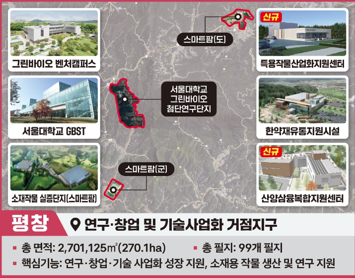 이번에 지정된 평창군 내 육성 지구 면적은 2,701,125㎡(270.1ha)이며, 서울대학교 Green-Bio 첨단 연구단지(대화면), 강원도 스마트팜(대관령면), 평창군 스마트팜(평창읍) 세 지역으로 구성된다.
