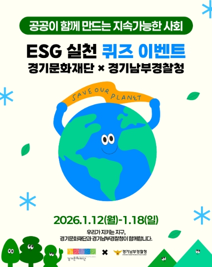 이번 이벤트는 친환경 에너지 기반 치안 장비 ‘팔달봇’을 운영하며 탄소 절감에 앞장서고 있는 경기남부경찰청과, 문화예술 공공기관 최초로 ESG 경영을 선언한 경기문화재단이 협력해 기획됐다. 양 기관은 SNS를 활용한 참여형 이벤트를 통해 ESG의 의미와 실천 가치를 도민들에게 쉽고 친근하게 전달할 예정이다.