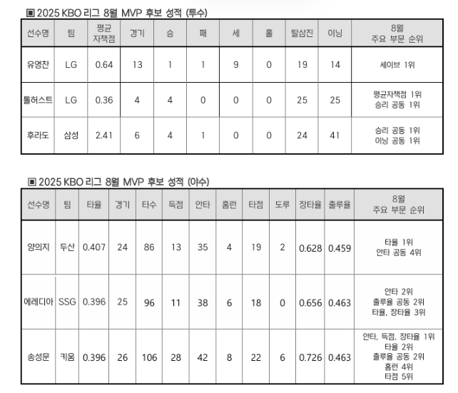 투수 부문에서는 LG 유영찬, 톨허스트와 삼성 후라도, 야수 부문에서는 두산 양의지, SSG 에레디아, 키움 송성문이 8월 월간 MVP 수상을 노린다.